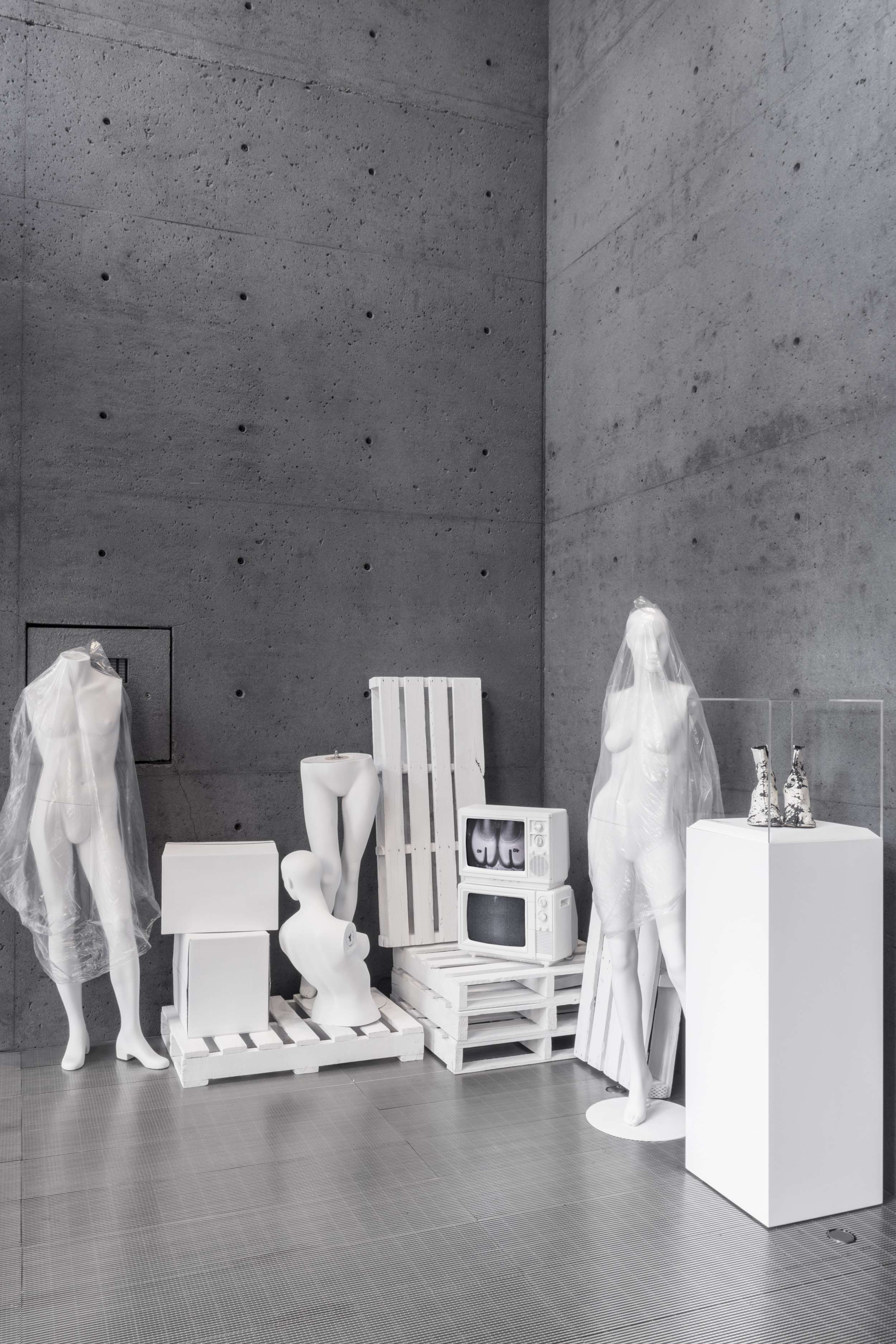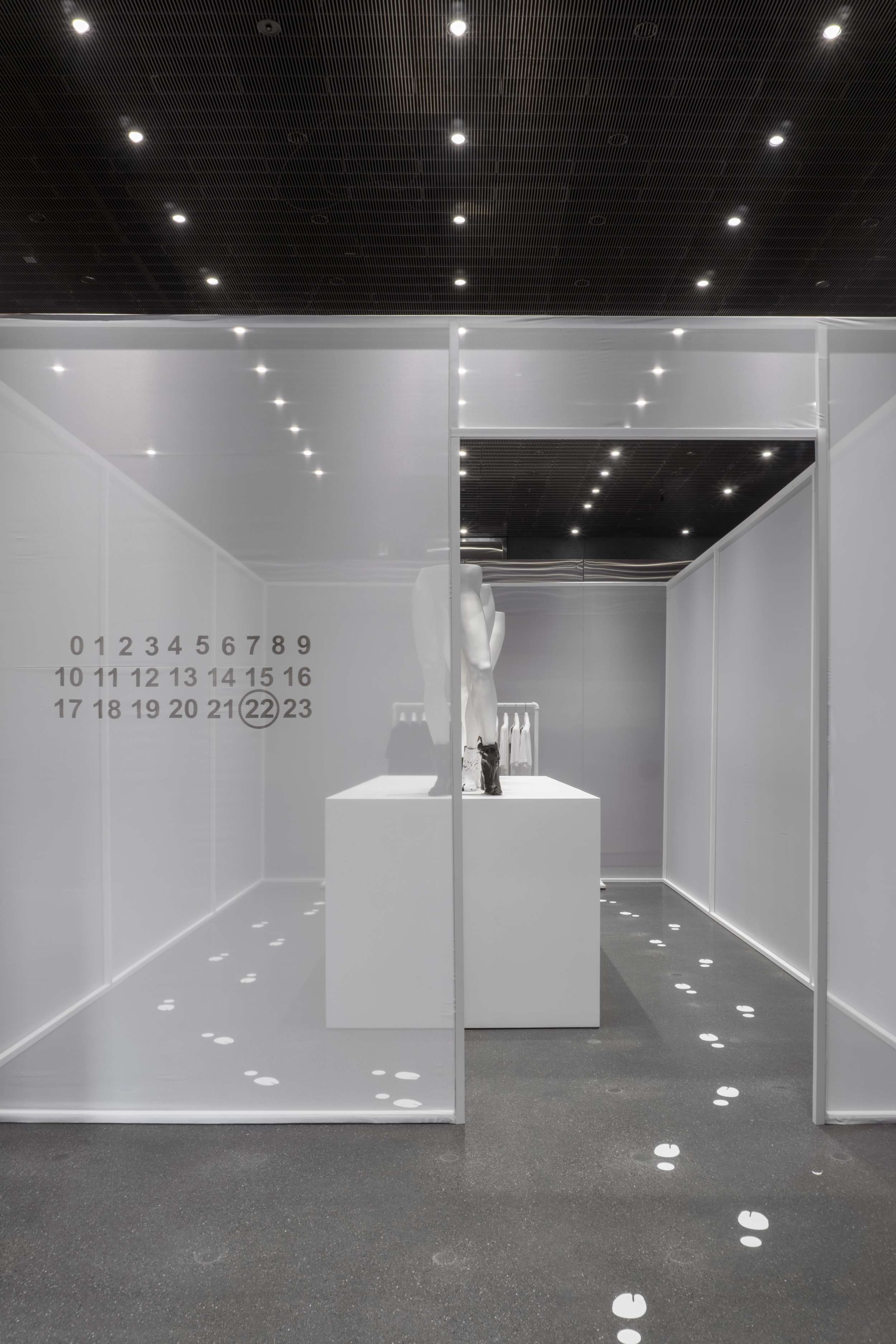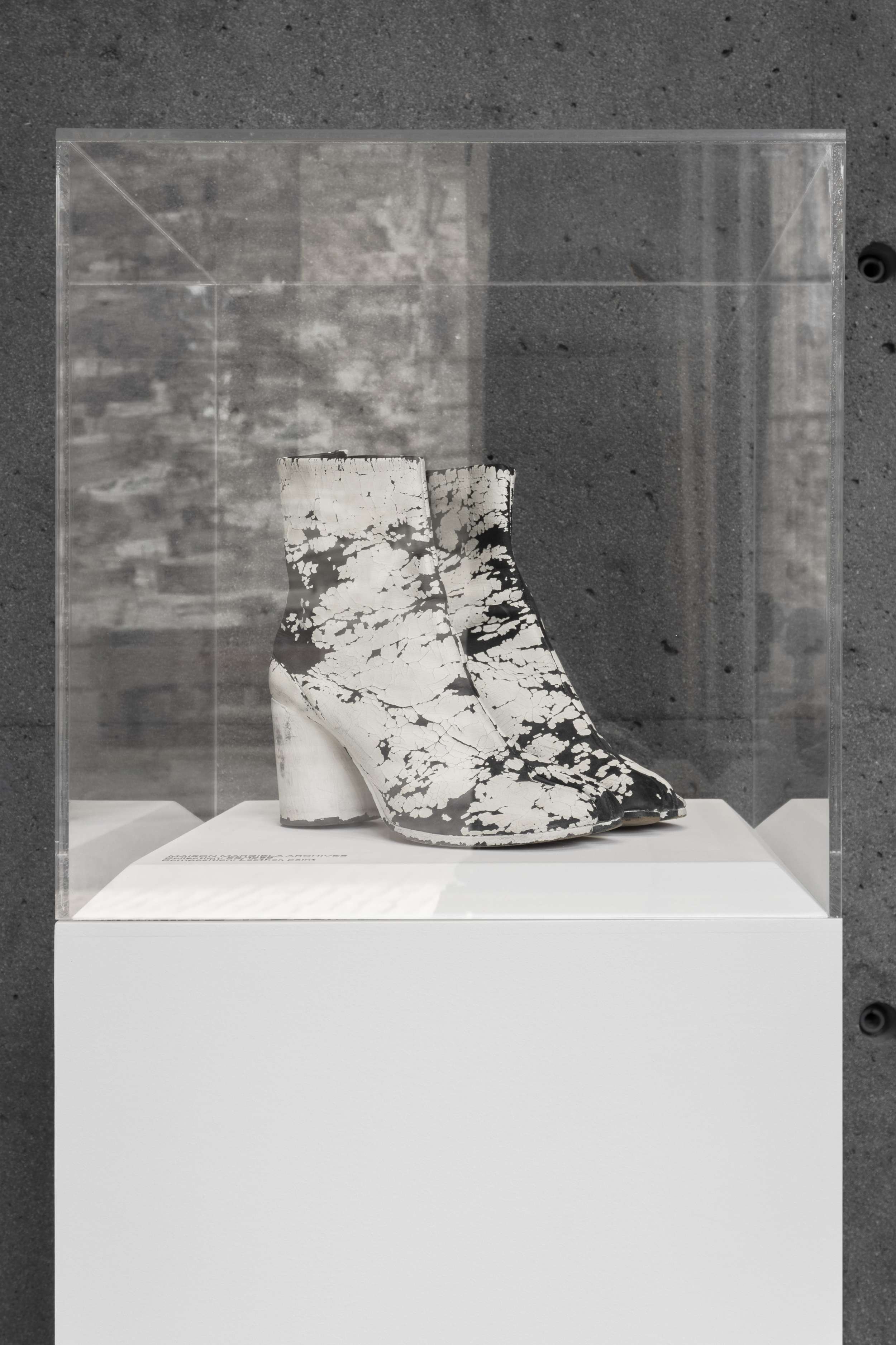 An installation on the first floor of the SSENSE store in the Vieux-Montréal district of Montreal commemorating the 30th anniversary of the Tabi boot. The north window display and door are covered with white acrylic latex paint, while a white neon tube sign hangs in the centre window. The lobby area features plastic covered mannequins, painted wood pallets, analog televisions, storage boxes, muslin wrapped chairs, and a vitrine displaying a pair of original white painted black Tabi boots (Spring/Summer 1989) from the Maison Margiela archive. In the main room, a partition wall structure is wrapped in a house gauze fabric that partially conceals a large podium presentation of the exclusive capsule collection.
